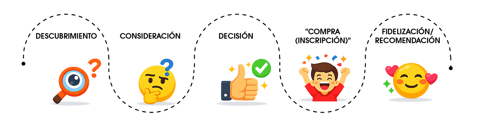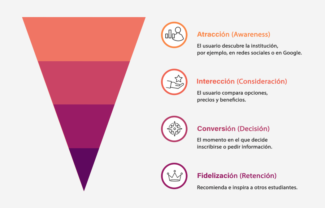 Atraer → interactuar → convertir → fidelizar estudiantes a través de canales digitales.